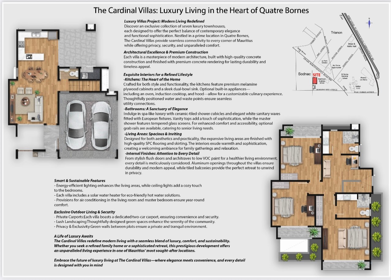 Step into refined living with this elegant 3-bedroom townhouse, part of a premium villa project in Quatre Bornes. Featuring sophisticated design, smart and sustainable features, and exclusive outdoor spaces, this home combines comfort, style, and security for a perfect family lifestyle.